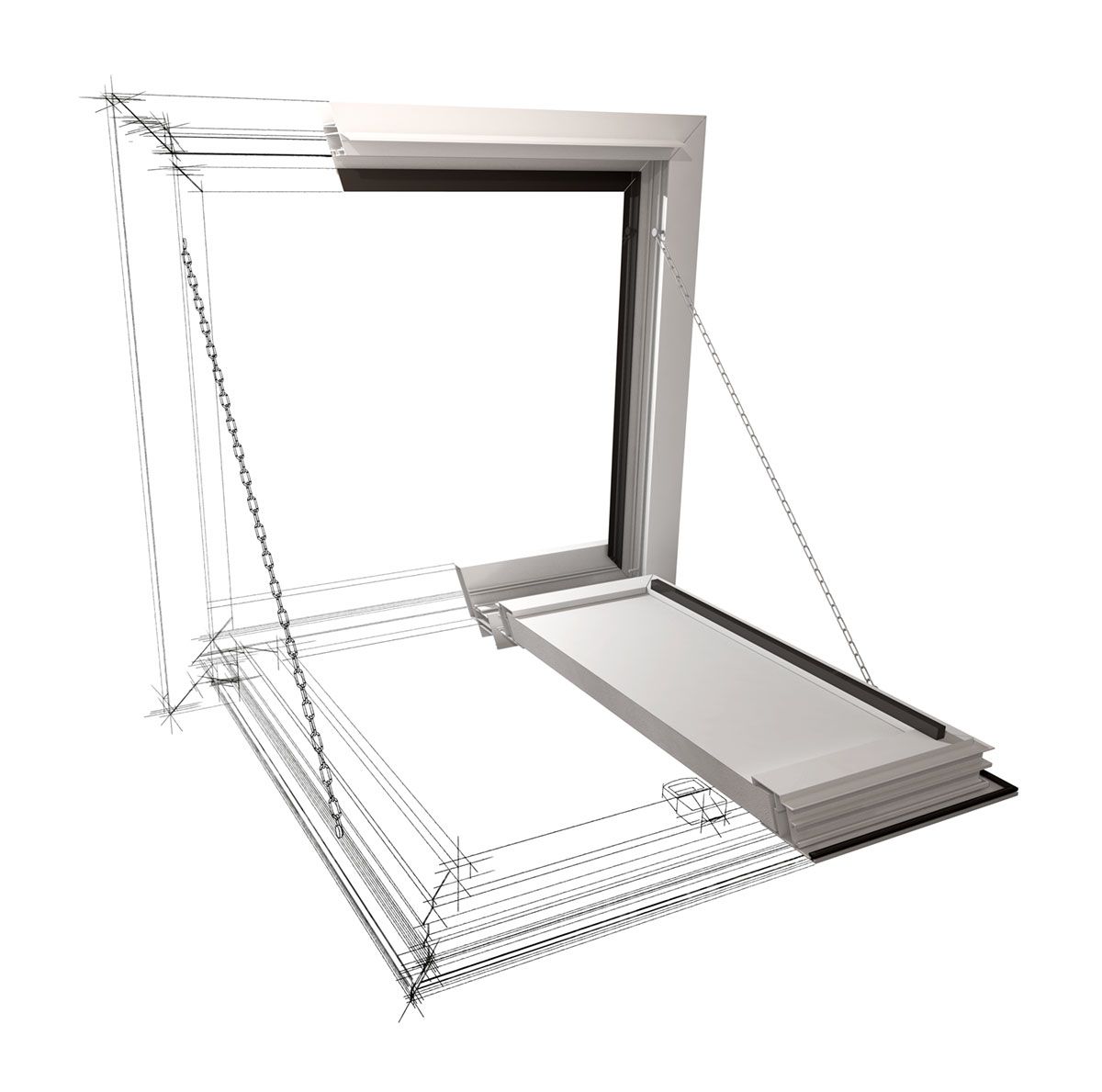 Sistema di bloccaggio anta in apertura con coppia di catenelle in acciaio o braccio snodato.
