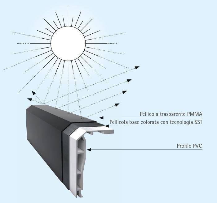 Per assicurare una protezione ancora maggiore, i nostri serramenti adottano la tecnologia Solar Shield (Scudo Solare), un’innovazione che prevede l’impiego di pigmenti speciali all’interno della pellicola superficiale. Questi pigmenti sono in grado di riflettere la componente infrarossa della luce solare, riducendo l’accumulo di calore nei profili in PVC.